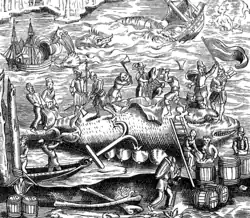 Whaling by humans has existed since the Stone Age. Ancient whalers used harpoons to spear the bigger animals from boats out at sea.[84] People from Norway and Japan started hunting whales around 2000 B.C.[85] Whales are typically hunted for their meat and blubber by aboriginal groups; they used baleen for baskets or roofing, and made tools and masks out of bones.[85] The Inuit hunted whales in the Arctic Ocean.[85] The Basques started whaling as early as the 11th century, sailing as far as Newfoundland in the 16th century in search of right whales.[86][87] 18th- and 19th-century whalers hunted whales mainly for their oil, which was used as lamp fuel and a lubricant, baleen or whalebone, which was used for items such as corsets and skirt hoops,[85] and ambergris, which was used as a fixative for perfumes. The most successful whaling nations at this time were the Netherlands, Japan, and the United States.[88]