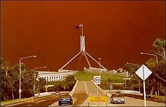 In the summer of 1974–1975 (southern hemisphere), Australia suffered its worst recorded wildfire, when 15% of Australia's land mass suffered "extensive fire damage".[86] Fires that summer burned up an estimated 117 million hectares (290 million acres; 1,170,000 square kilometres; 450,000 square miles).[87][88] In Australia, the annual number of hot days (above 35 °C or 95 °F) and very hot days (above 40 °C or 104 °F) has increased significantly in many areas of the country since 1950. The country has always had bushfires but in 2019, the extent and ferocity of these fires increased dramatically.[89] For the first time catastrophic bushfire conditions were declared for Greater Sydney. New South Wales and Queensland declared a state of emergency but fires were also burning in South Australia and Western Australia.[90]