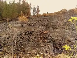 Dense forests usually provide more shade, resulting in lower ambient temperatures and greater humidity, and are therefore less susceptible to wildfires.[46] Less dense material such as grasses and leaves are easier to ignite because they contain less water than denser material such as branches and trunks.[47] Plants continuously lose water by evapotranspiration, but water loss is usually balanced by water absorbed from the soil, humidity, or rain.[48] When this balance is not maintained, often as a consequence of droughts, plants dry out and are therefore more flammable.[49][50]