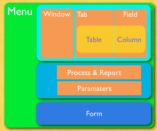 The Window, Tab & Field Window defines the presentation (GUI) of tables and columns within each window.