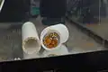 A newly laid clutch of about 250 eggs can be seen at the top of the inside of the clay pot. They are orange in color and capsule-shaped.