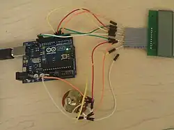 - Connect a wire from the 5V pin of the Arduino to the left terminal of the potentiometer which should be connected to pin 2 of the LCD, then connect a wire from a GND pin on the Arduino to the right terminal of the potentiometer which should be connected to pins 1 and 5 of the LCD