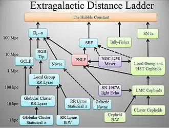 The figure to the left shows what Wikipedia calls the w:Cosmic distance ladder.[4] The ladder analogy arises because no one technique can measure distances at all ranges encountered in astronomy. Instead, one method can be used to measure nearby distances, a second can be used to measure nearby to intermediate distances, and so on. Each rung of the ladder provides information that can be used to determine the distances at the next higher rung.