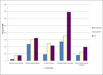 In the process implementation stage, the three alternatives received similar scores. This is because virgin materials such as steel and plastics are used in the manufacturing of the equipment. In the primary process operation phase wet and GreenEarth® cleaning scored higher than perc cleaning because perc is a toxic substance and the liquid waste formed during operation cannot be disposed of by regular means. The other two alternatives use non-toxic solvents and can be released into the drains.