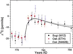 - ↑ A.J.T. Jull; I.P. Panyushkina; T.E. Lange; et al. (2014). "Excursions in the 14C record at AD 774-775 in tree rings from Russia and America". Geophys. Res. Lett. 41: 3004–3010. doi:10.1002/2014GL059874.