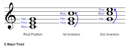 Earlier in the course, it was discussed how triads are based on a root note that is part of the key. Inversions occur when the root note is not at the bottom of the chord.