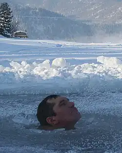 Winter swimming is the activity of human swimming during the winter season, typically in outdoor locations, or in unheated pools or lidos. It is done mostly for health benefits. Many winter swimmers swim with standard swimming costumes rather than with wetsuits or other thermal protection.