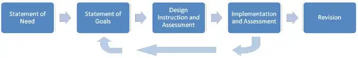 The sequence of activities for instructional design may also be described as identifying instructional needs, identifying instructional goals, designing instruction and assessment, implementing and assessing the design, and then revising goals, design, and implementation as necessary:
