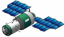 Salyut 7 a.k.a. DOS-6, short for Durable Orbital Station[32]) was a space station in low Earth orbit from April 1982 to February 1991.[32] It was first crewed in May 1982 with two crew via Soyuz T-5, and last visited in June 1986, by Soyuz T-15.[32] Various crew and modules were used over its lifetime, including 12 crewed and 15 uncrewed launches in total.[32] Supporting spacecraft included the Soyuz T, Progress, and TKS spacecraft.[32]