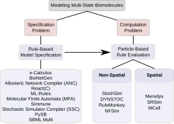 The combinatorial complexity of signaling systems involving multi-state proteins poses two kinds of problems. The first problem is concerned with how such a system can be specified; i.e. how a modeler can specify all complexes, all changes those complexes undergo and all parameters and conditions governing those changes in a robust and efficient way. This problem is called the "specification problem". The second problem concerns computation. It asks questions about whether a combinatorially complex model, once specified, is computationally tractable, given the large number of states and the even larger number of possible transitions between states, whether it can be stored electronically, and whether it can be evaluated in a reasonable amount of computing time. This problem is called the "computation problem". Among the approaches that have been proposed to tackle combinatorial complexity in multi-state modeling, some are mainly concerned with addressing the specification problem, some are focused on finding effective methods of computation. Some tools address both specification and computation. The sections below discuss rule-based approaches to the specification problem and particle-based approaches to solving the computation problem. A list of the tools discussed here is presented in Figure 1. A comprehensive overview and discussion of various tools available for multi-state modeling can be found in Chylek et al.[31]