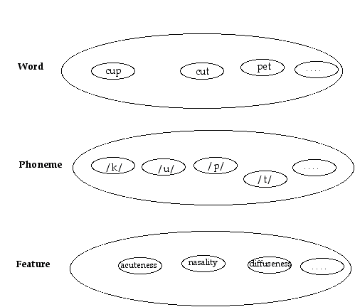 - Feature level - At this level, there are several banks of feature detectors. Each features has its only place in speech time, and they are organized in successive order.