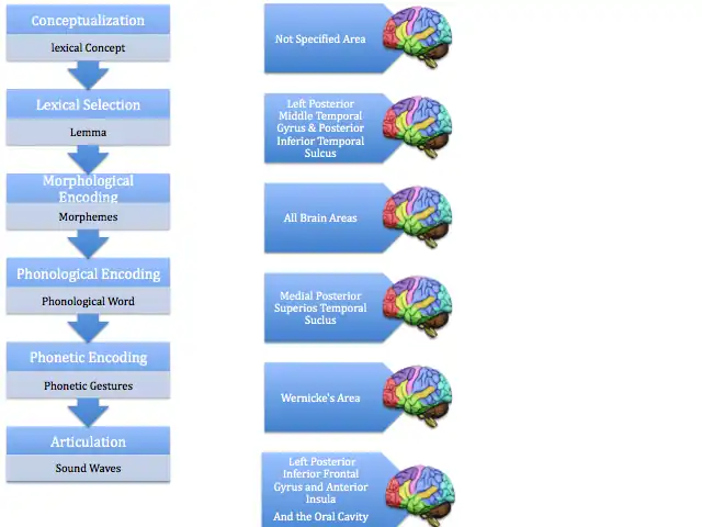 The Weaver model was designed to show, at a conceptual level, the processes and the outputs from each cognitive level within the brain. This section will attempt to link the classic Weaver model with newer research to propose locations and regions that these processes and outputs are taking place neutrally. This linkage was summarized nicely in a article by Gregory Hickok in 2010.