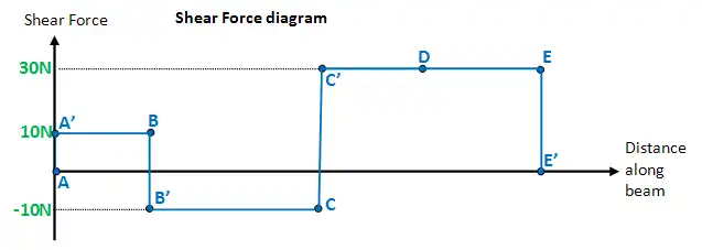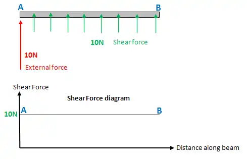 Below a force of 10N is exerted at point A on a beam. This is an external force. However because the beam is a rigid structure, the force will be internally transferred all along the beam. This internal force is known as shear force. The shear force between point A and B is usually plotted on a shear force diagram. As the shear force is 10N all along the beam, the plot is just a straight line, in this example.
