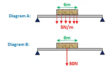 Below is a brick lying on a beam. The weight of the brick is uniformly distributed on the beam (shown in diagram A). The brick has a weight of 5N per meter of brick (5N/m). Since the brick is 6 meters long the total weight of the brick is 30N. This is shown in diagram B. Diagram B is a simplification of diagram A. As you will see, you will need to be able to convert a type A diagram to a type B.