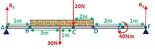 Point moments are something that you may not have come across before. Below, a point moment of 20Nm is exerted at point C. Work out the reaction of A and D: