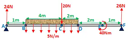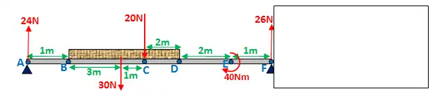 Bending moment at F: 24·10 - 30·6 - 20·5 + 40 = 0Nm
