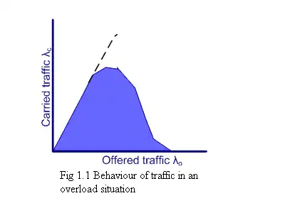 If the maximum processing load the processor can handle is φmax to carry a maximum traffic of λmax then φmax must be less than 1 to allow for the background tasks of the processor which cannot be delayed indefinitely. If the amount of traffic offered exceeds λmax and overload occurs and the calls have to be queued beyond a subscriber’s patience. The subscriber will reattempt the call and lead to further congestion. This cyclic process will lead to a breakdown of the system and carried traffic will be zero while the offered traffic continues to grow indefinitely the graph below [adapted from [2] 215].