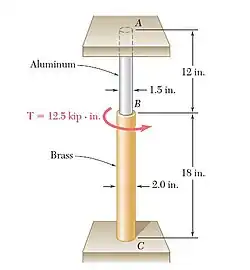 The solid cylinders AB and BC are bonded together and are attached to fixed supports at A and C. Know the modulus of both aluminum and brass, determine the maximum shearing stress in both AB and BC.