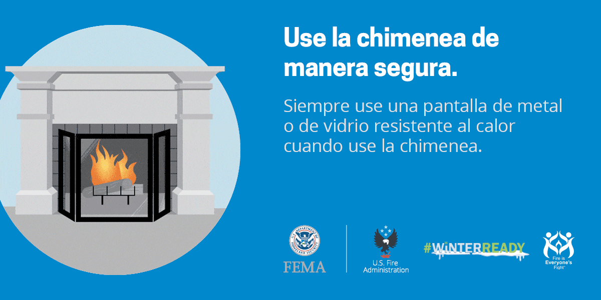 Animation of a fireplace. Text: always use your fireplace safely. Always use a metal or heat-tempered screen when using your fireplace. FEMA, USFA, Fire is Everyone’s Fight logos. #WinterReady hashtag.